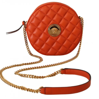 Bolso bandolera redonda, naranja, con medusa, de Versace. K11348