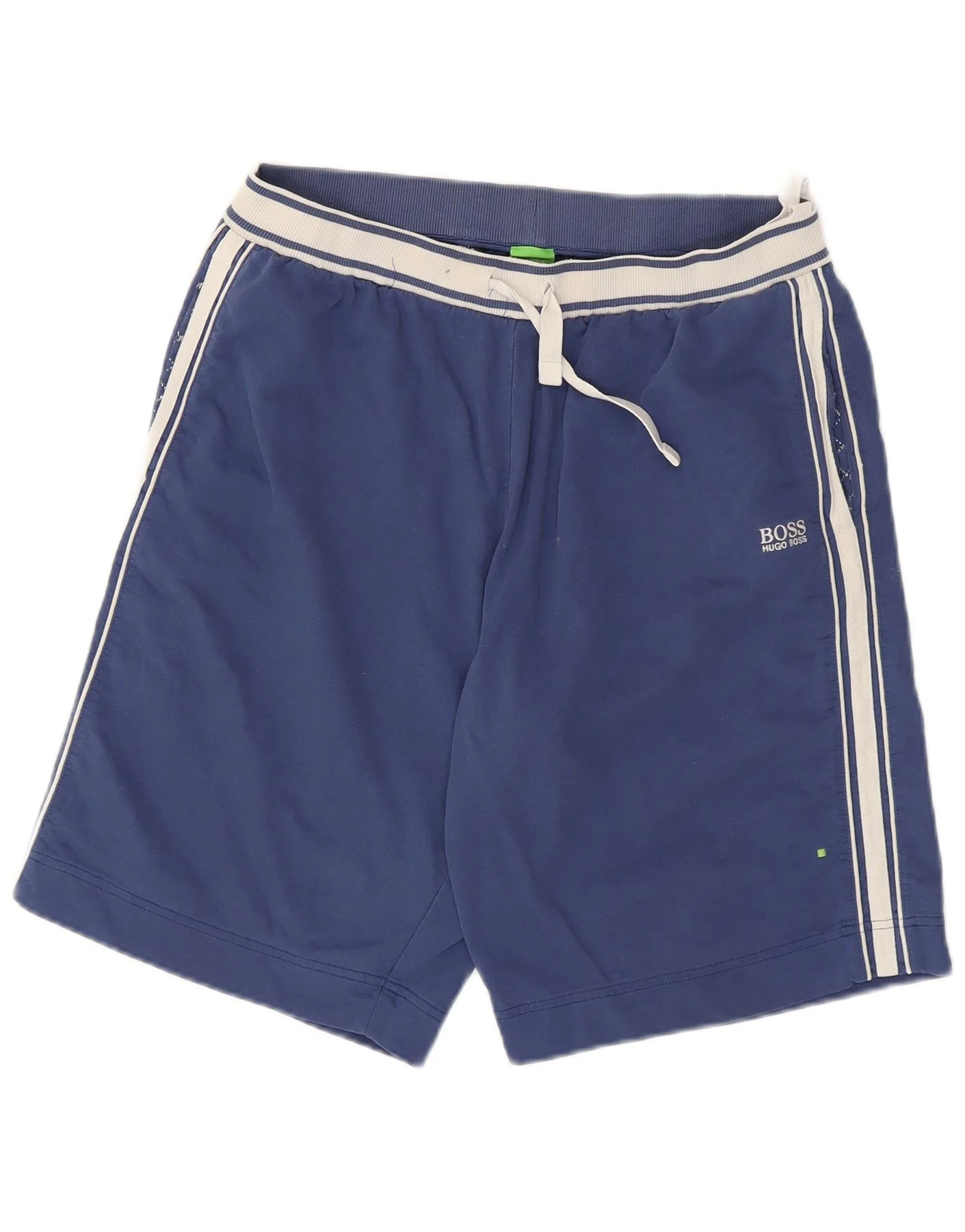 - Descripción de IA: This Hugo Boss mens shorts are crafted from soft blue jersey fabric. They feature a comfortable regular fit and an elasticated drawstring waist. Practical pockets add functionality. A subtle striped pattern enhances the design. The signature Hugo Boss logo provides a refined accent. Ideal for sports or casual wear, offering both comfort and style.