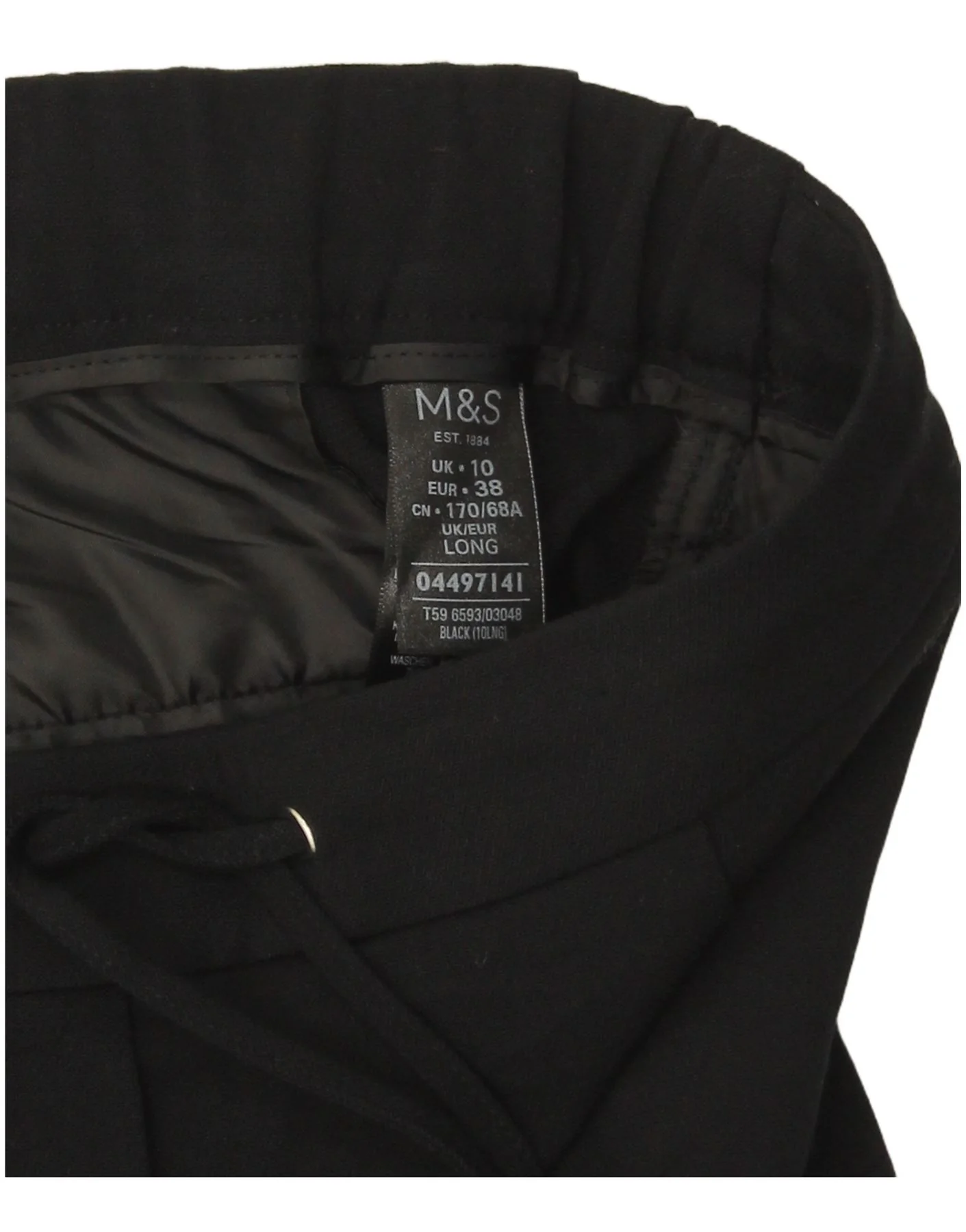 - Descripción de IA: These Marks & Spencer womens casual trousers are crafted from a comfortable woven fabric, presented in classic black. They feature a relaxed fit with a modern cropped length. An elasticated drawstring waist ensures a comfortable, adjustable fit. The cuffed hems add a neat, contemporary finish. Practical pockets enhance their everyday appeal, making them a versatile wardrobe staple.